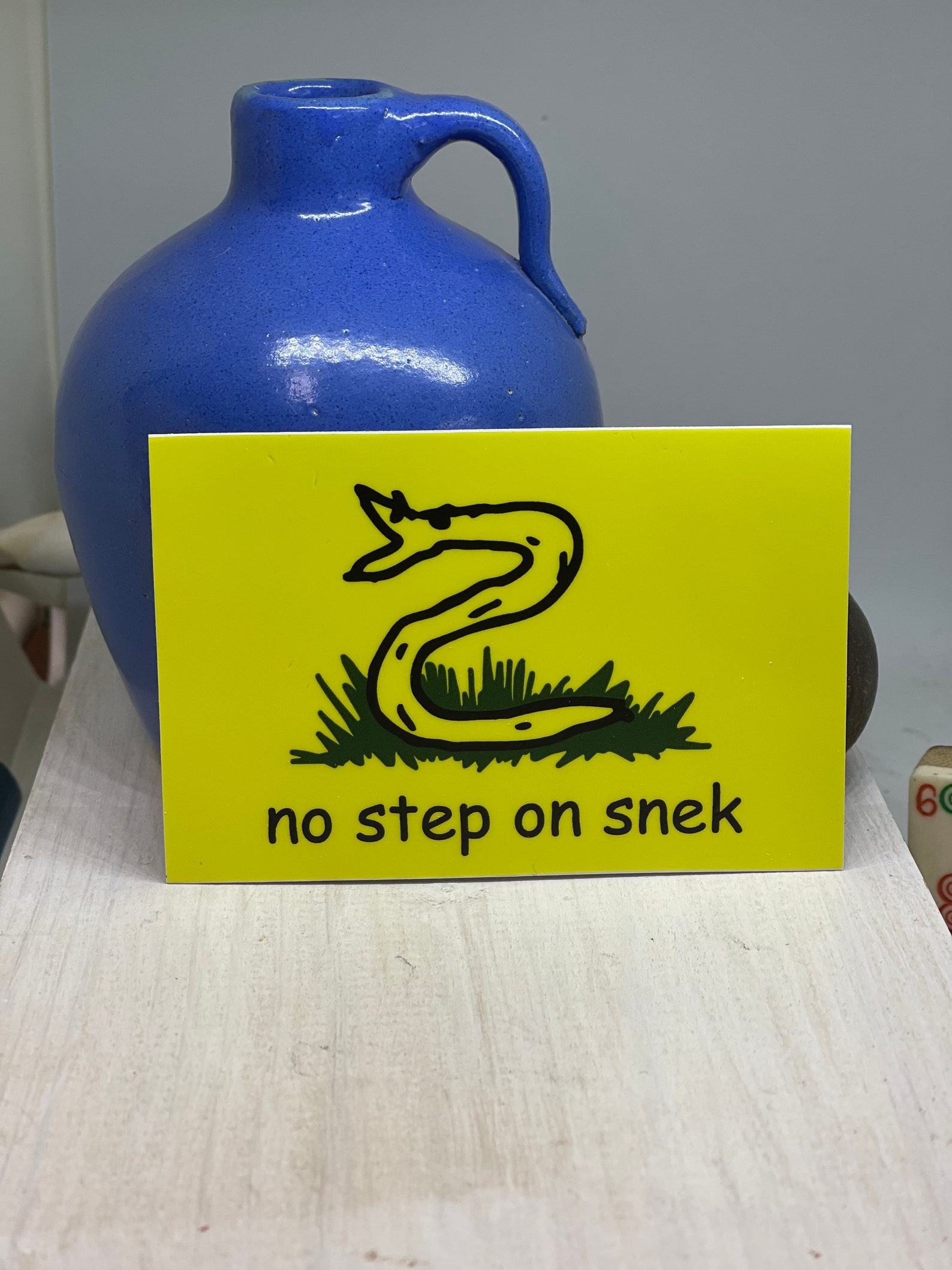 . The Meaning of "No Step On Snek" If the imagery and words happen to ring a vague bell in your mind, it might be because this phrase and meme format is actually a crude rendition of the Gadsden Flag and the saying "don't tread on me". "No step on snek" is the humorous reiteration of the iconic phrase of the Gadsden Flag, Don't Tread on Me.